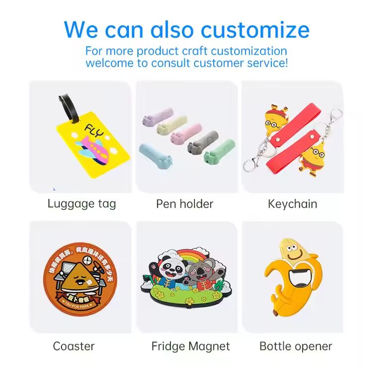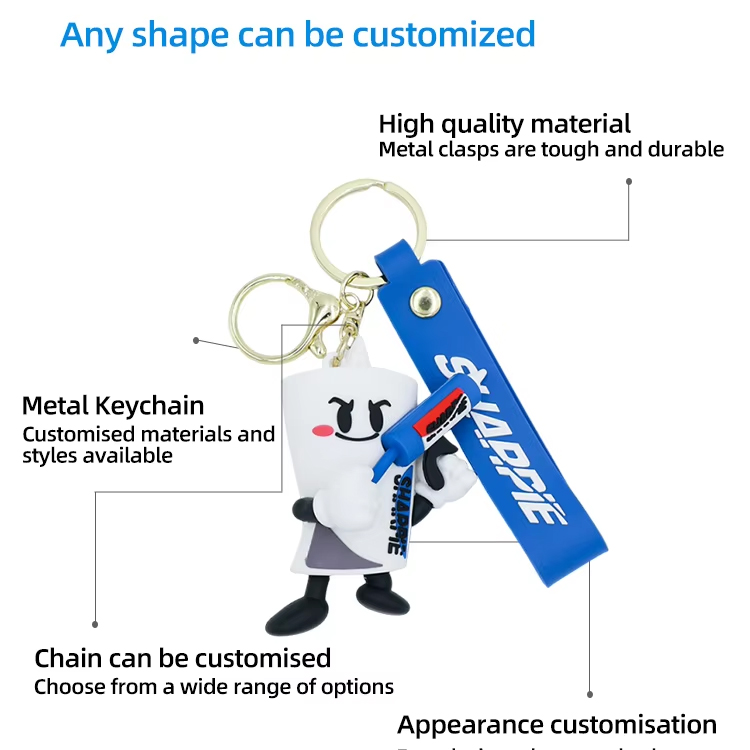 اجعل علامتك التجارية أو فكرتك تنبض بالحياة من خلال تصميمات ثنائية أو ثلاثية الأبعاد مخصصة بالكامل. سواء كان شعارًا أو تميمة أو شعارًا، فإن سلاسل المفاتيح الناعمة المصنوعة من مادة PVC مصممة لتتناسب مع رؤيتك بألوان نابضة بالحياة وتفاصيل عالية.