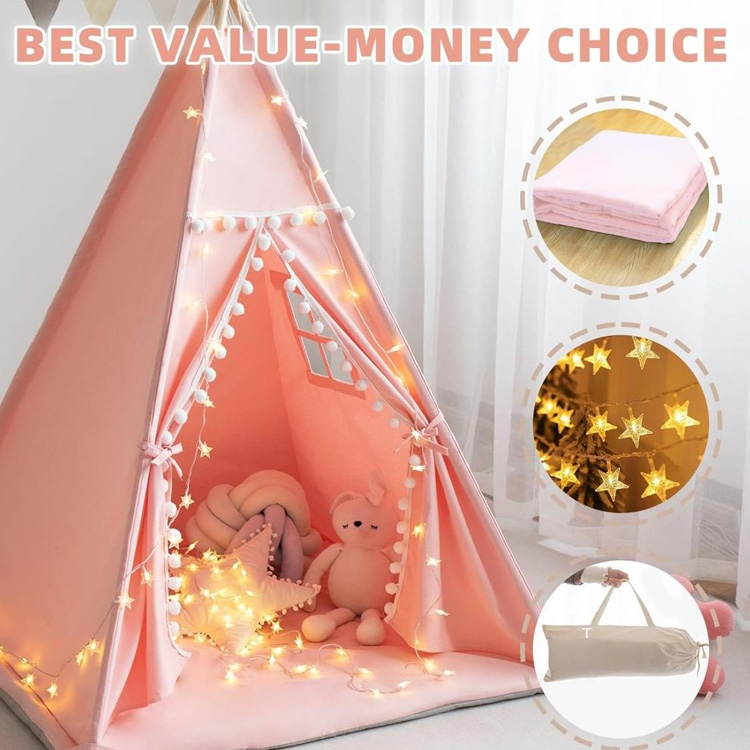 خيمة تيبي للأطفال من القماش القطني للأطفال مع بساط. مساحة لعب سحرية مثالية للمغامرات الإبداعية. تشتمل خيمة تيبي المصنوعة من القماش القطني على بساط مريح وأضواء نجوم ساحرة وحقيبة حمل مريحة. مثالية لإلهام اللعب الخيالي وخلق ذكريات طفولة دائمة.