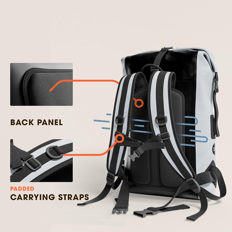 يتضمن حزام كتف مبطن مريح، ومقابض حمل متعددة، وأشرطة ضغط خارجية للربط الآمن بحقائب الظهر أو القوارب المائية أثناء الحركة النشطة.