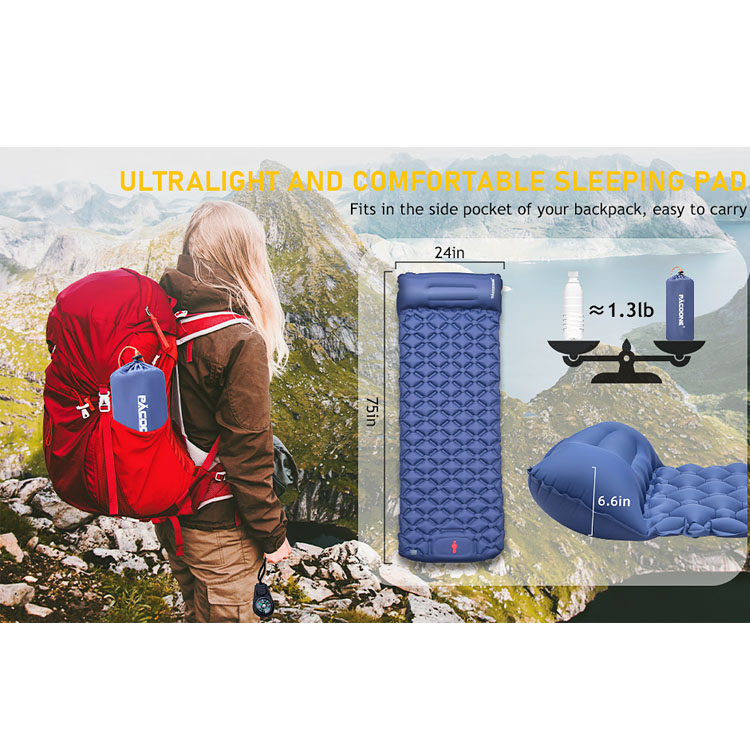 وسادة نوم خفيفة الوزن مصنوعة من مادة النايلون قابلة للطي للتخييم. حل النوم المحمول المثالي للمغامرات الخارجية. تتميز هذه المرتبة الخفيفة القابلة للنفخ بميزة النفخ بضغطة واحدة وتصميم وسادة متكامل. مصنوع من مادة النايلون المتينة، ويوفر راحة فائقة للمشي لمسافات طويلة والتخييم، مما يضمن ليالي مريحة في أي مكان.