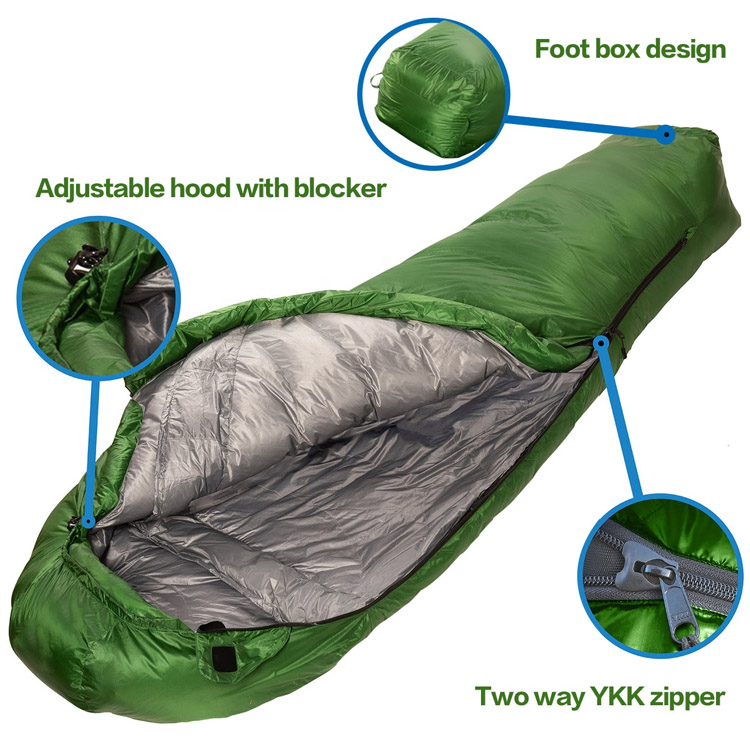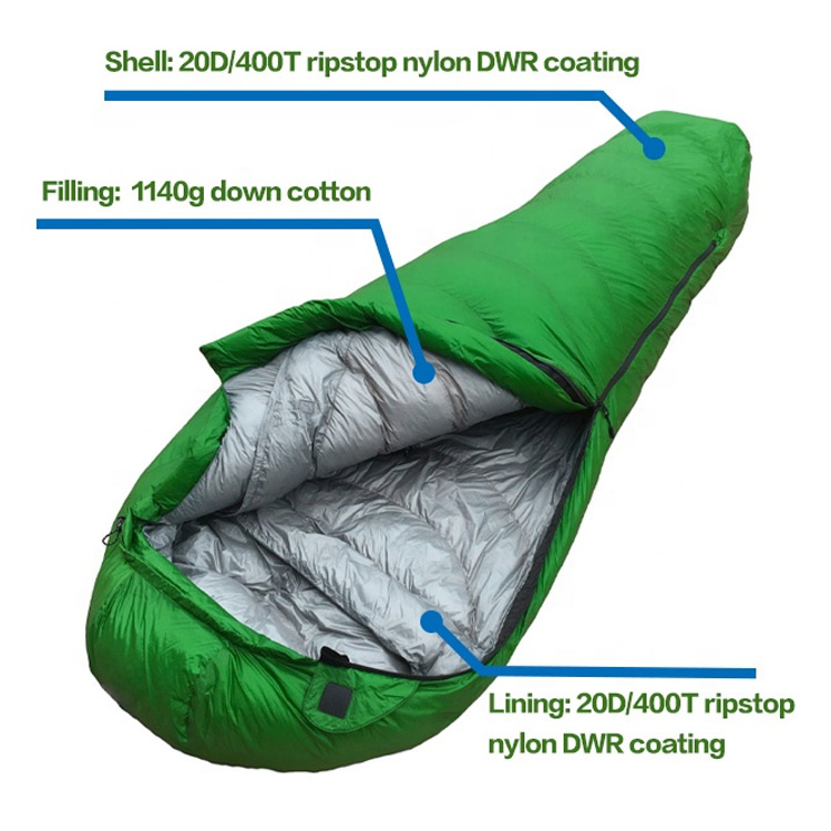 حقيبة نوم المومياء المحمولة خفيفة الوزن للاستخدام في الهواء الطلق في الطقس البارد. الحل الأمثل للنوم في الطقس البارد للمغامرات البرية. تتميز حقيبة نوم المومياء خفيفة الوزن هذه بعزل ممتاز من ريش الإوز للحصول على أقصى قدر من الدفء. مصمم للتخييم الجدي، فهو يجمع بين الكفاءة الحرارية الاستثنائية والحد الأدنى من وزن العبوة.